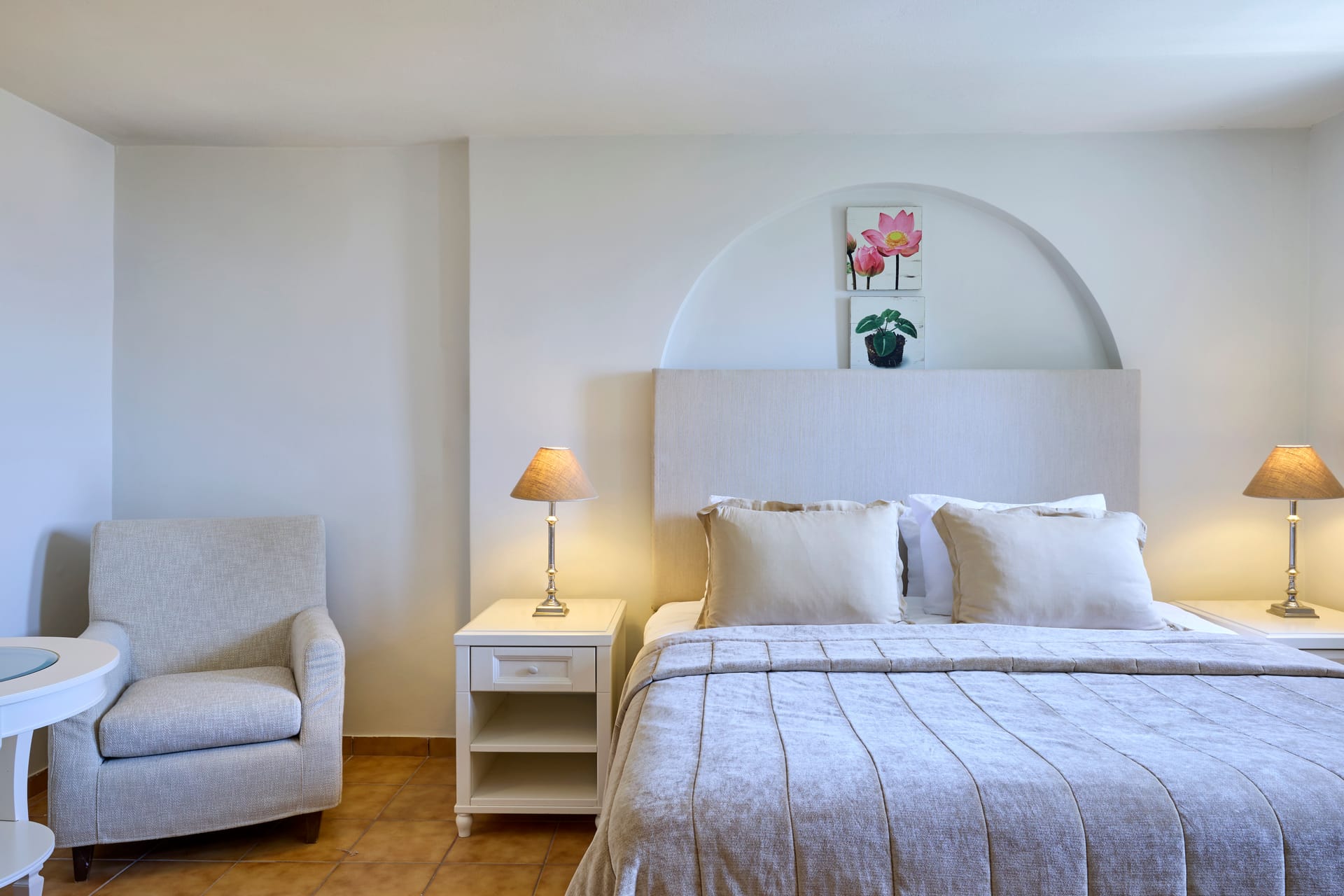 Elegant décor complements cozy chairs and sofa, renowned Hypnos king size bed, sensual moments with luxury fabrics and Candle light atmosphere. Pampering extras include welcome gift on arrival and evening turndown service.