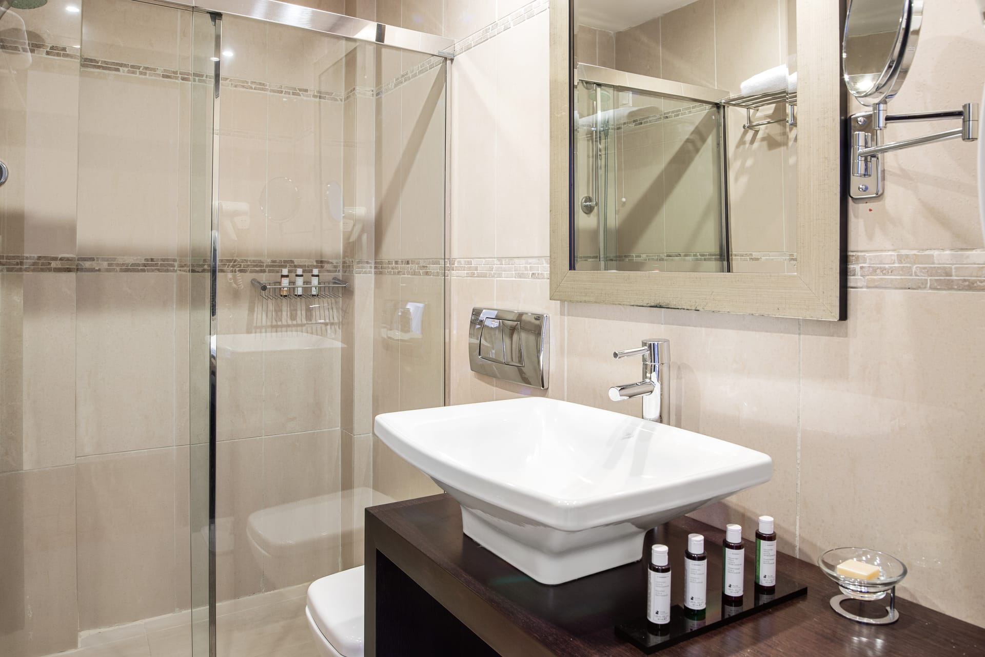 Pampering extras include welcome gift on arrival and evening turndown service.